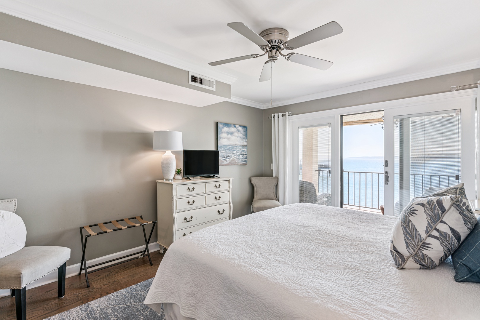 Bedroom 1 – Primary with King (sleeps 2), access to the covered balcony and amazing VIEWS