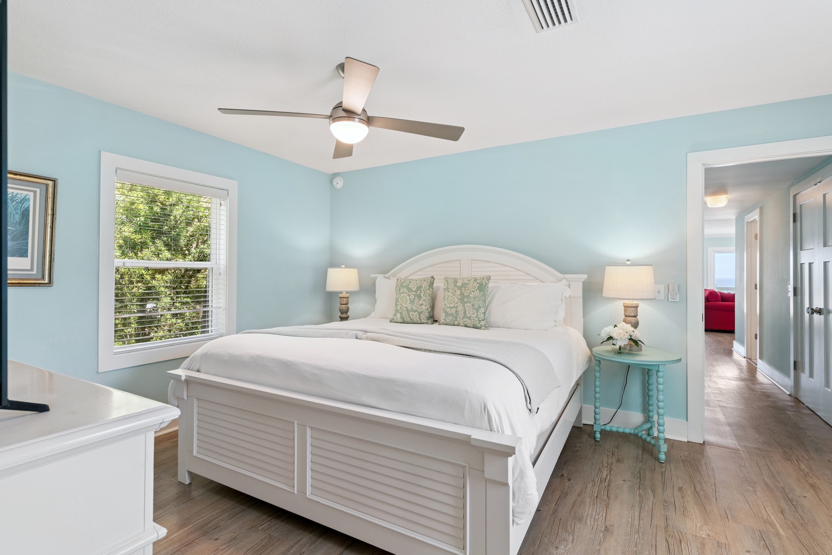 Each unit features two bedrooms with comfortably appointed king beds and an open dining room/living room with a sofa sleeper with unobstructed ocean views . A queen-sized air mattress is also available. Two bathrooms feature a tub with shower and walk-in shower, respectively. Renovations to the kitchen, baths, flooring, windows, walls, etc., include comfortable furnishings, all tile and wood flooring, both air conditioning and ceiling fans, and a laundry room. We have a flat screen TV in both the living room and primary bedroom.