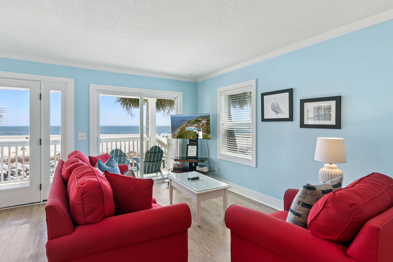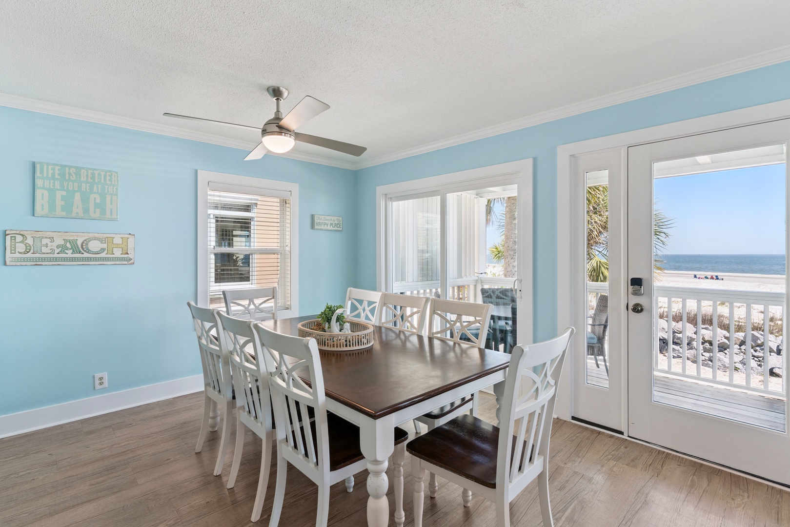 SEACLUSION is located directly on the sandy shore of the Atlantic Ocean, within one-half mile or a 10-minute walk to the village/pier area. Our home has recently been renovated and features a DIRECT and UNOBSTRUCTED VIEW of the Atlantic Ocean, the beach, the shipping channel, and Jekyll Island. You will have peace and quiet in your private beachfront backyard while enjoying 180-degree beautiful ocean views from your living room, open kitchen, and dining room through two sets of big glass sliders. You can see Jekyll Island and Cumberland Island from the patio and living room, and throughout the day you can experience the ever-changing tidal patterns that come with the ocean's gentle ebb and crashing flow on the rocks in front of SEACLUSION.