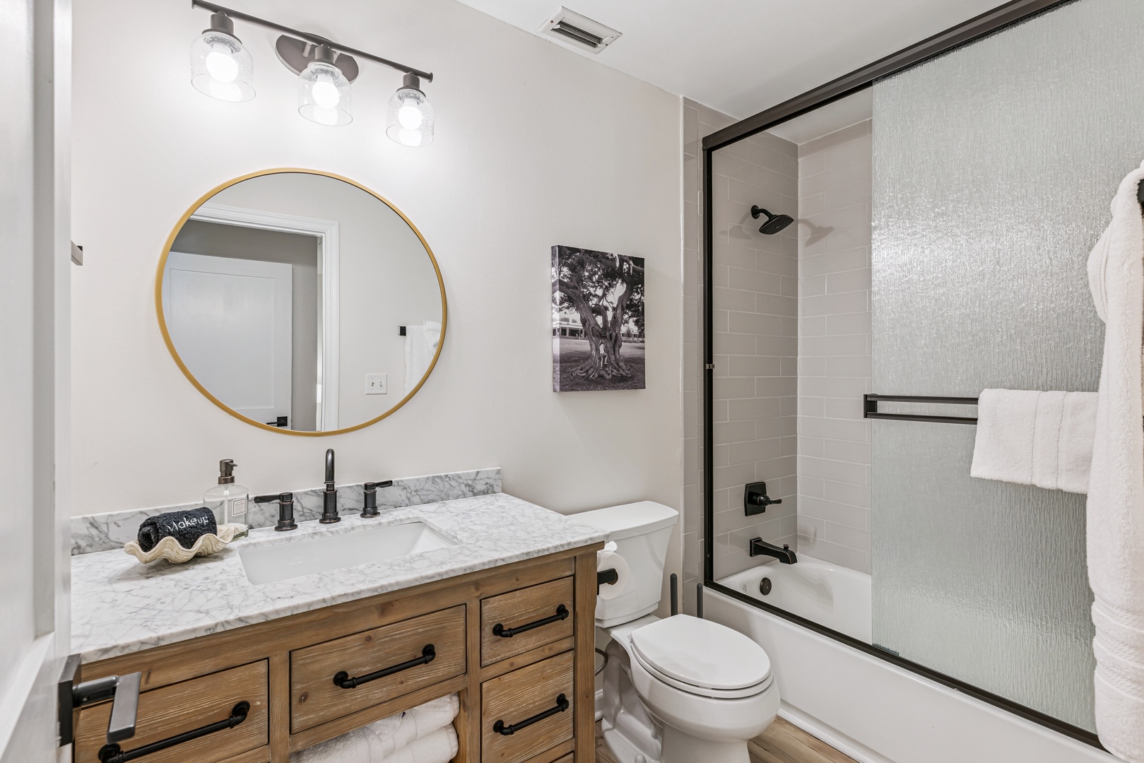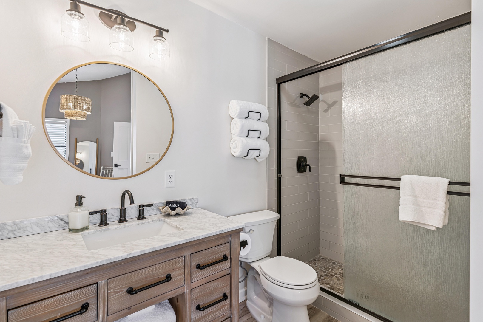 Bathroom 1: A private ensuite bathroom with a single vanity and a step-in shower