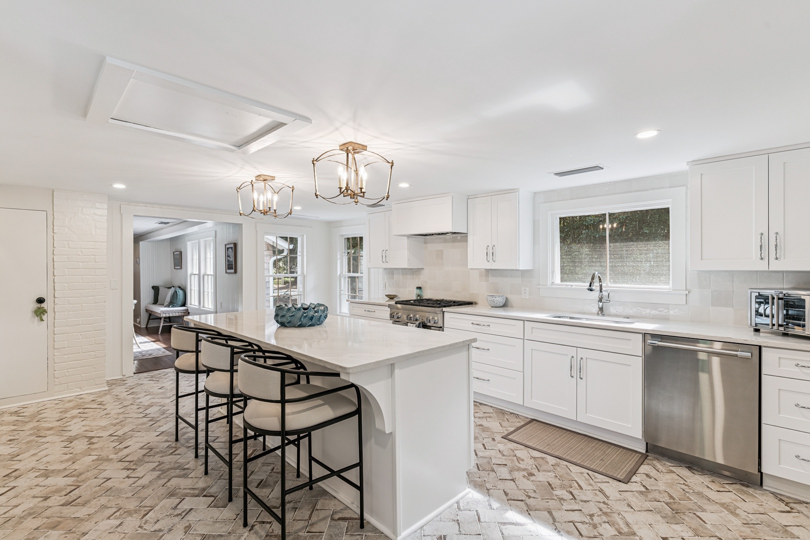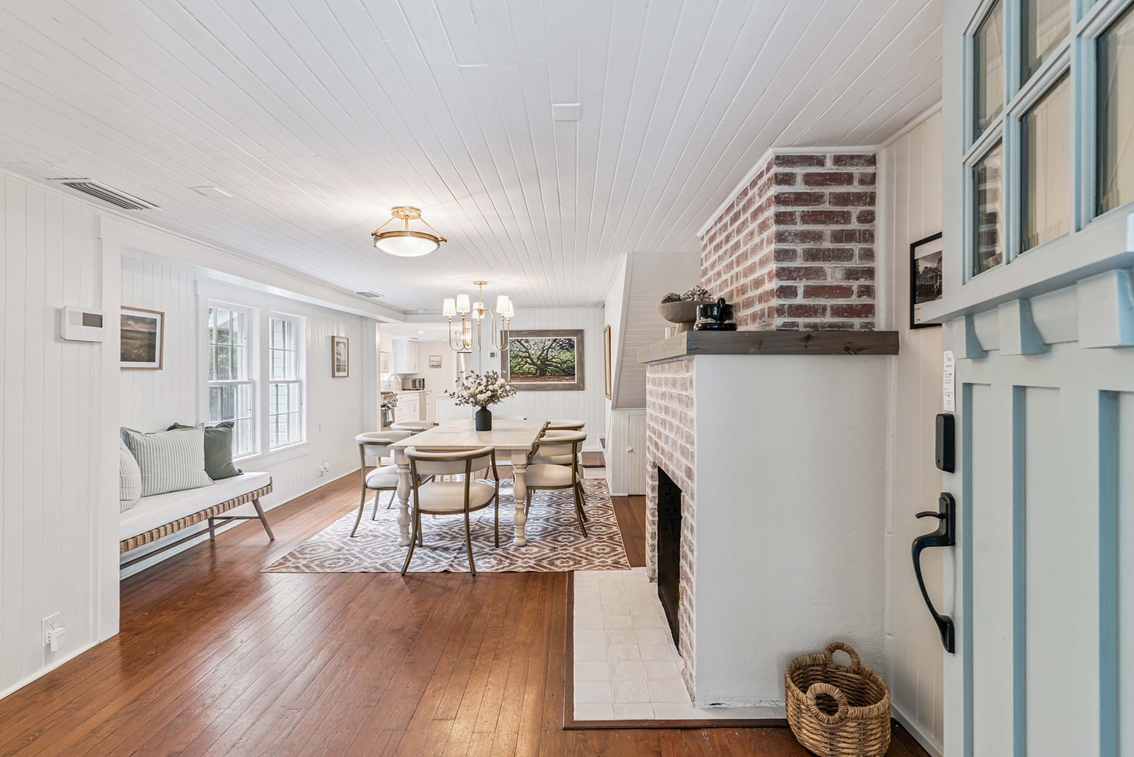 The main level features a newly added primary bedroom suite, a second bedroom and bath, and a spacious kitchen adorned with brick floors. The dining room, enhanced by a cozy fireplace, serves as a welcoming foyer, while the living room/den connects to a full bath that conveniently doubles as a pool bath.
