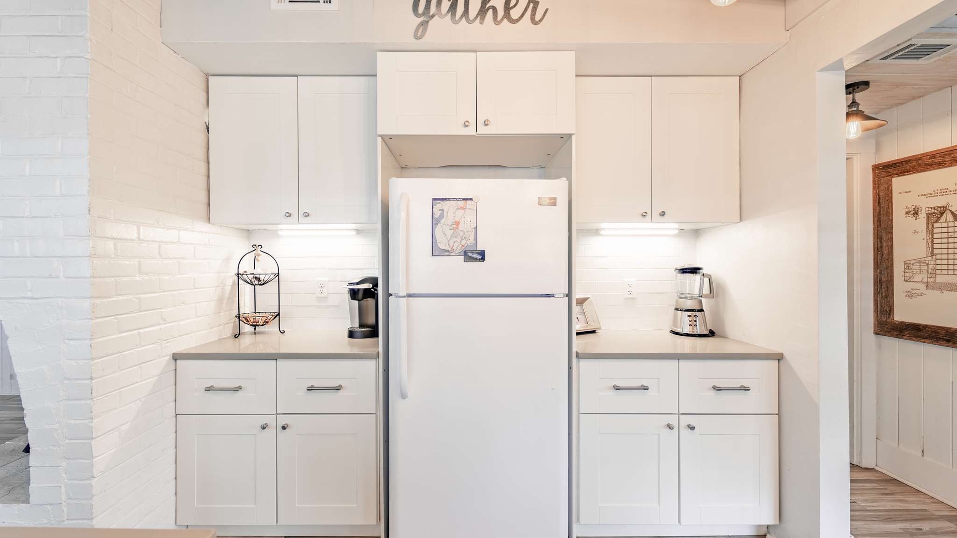 The kitchen features new appliances, single serve and drip coffee maker, and all the cookware you may need for dining in.